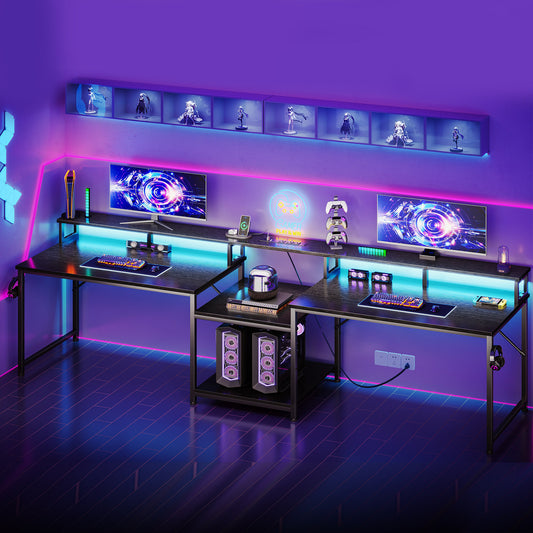 Sofanext 98" Computer Desk with USB Ports & Power Outlets, Large Gaming Desk with Display Stand & LED Strip, Storage Shelves for Home Office, Suitable for 2 People Use, Black