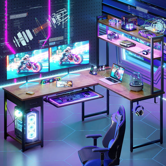59" Reversible L-Shaped Gaming Desk with Power Outlets & LED Lights, Office Desk with Storage Drawer & Keyboard Tray for Home Office, Corner Computer Desk with Hutch, Vintage