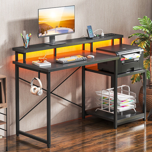 51 inch Gaming Desk with LED Lights & Power Outlet, Gaming Table with Movable Monitort Shelf Kids Desk Gift for Boys Men, Home Office Desk with Headphone Hook, Carbon Fiber Black