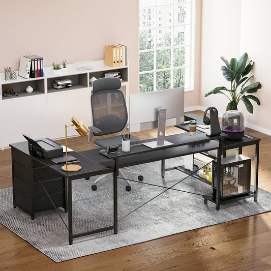 66" Reversible L Shaped Desk with File Drawer & Power Outlet, Modern Computer Desk with LED Strip, Home Office Desk with Storage Shelves, Gaming Desk with Monitor Shelf, Corner Desk, Black