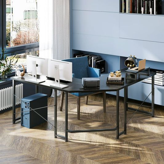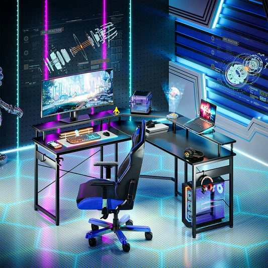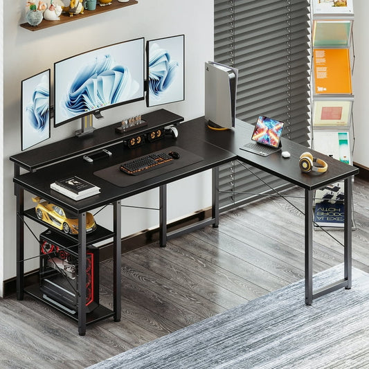 L Shaped Reversible Gaming Desk with Storage Shelves, 53-inch Home Office Desk, Corner Study Table with Monitor Stand, Modern Work Desk, Black