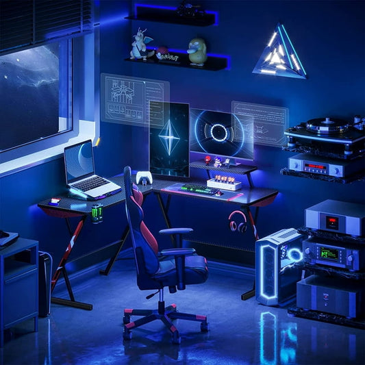 51 inch Computer Desk L Shaped with Led Lights & Power Outlets, Full-Sized Monitor Shelf, Corner Carbon Fiber Texture, Gaming Table with Hooks, Black Carbon Fiber