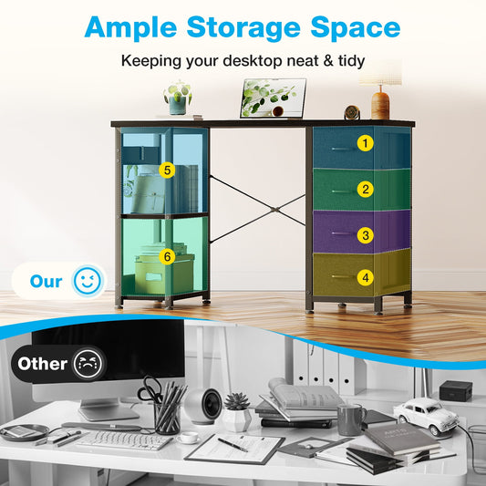 48 inch Computer Desk with 4 Fabric Drawers — Home Office Desks with Storage, Writing Desk with Side Hook, Kids Desk Study/Work Table for Bedroom and Small Space, Oak Grey
