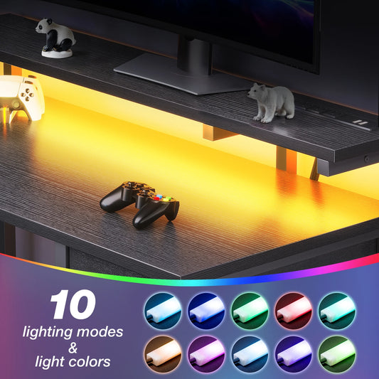 Reversible 59 inch L Shaped Computer Desk with LED Lights & Power Outlet, Gaming Table with Monitor Stand & Storage Drawer, Corner Desk with Storage Shelves, Pure Black