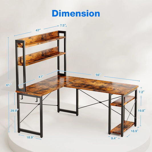Sofanext 59" Reversible L-Shaped Gaming Desk with Hutch, Corner Computer Table with Storage Shelves for Home Office, Vintage