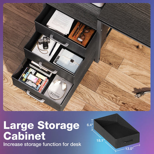 58 Inch Reversible Computer Desk with Power Outlets and LED Light, Office Desk with 3 Drawers& Storage Shelves, Modern Study Table with PC Stand for Home Office, Black