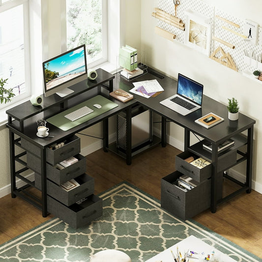 L Shaped Desk with Drawer, 59 inch Computer Desk with Monitor Stand, Reversible Corner Desk, Gaming Desk with Storage Shelves, Home Office Desk, Black