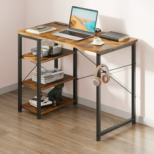 Modern Writing Desk with 3 Tier Shelves for Small Space, Computer Table with Power Outlet & USB Charging Port, Vintage