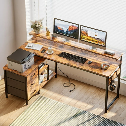 55 inch L Shaped Computer Desk with Drawers & Power Outlets, L-Shaped Gaming Desk with Removable File Cabinet, Reversible Corner Desk with Monitor Stand for Home Office Workstation, Rustic Brown