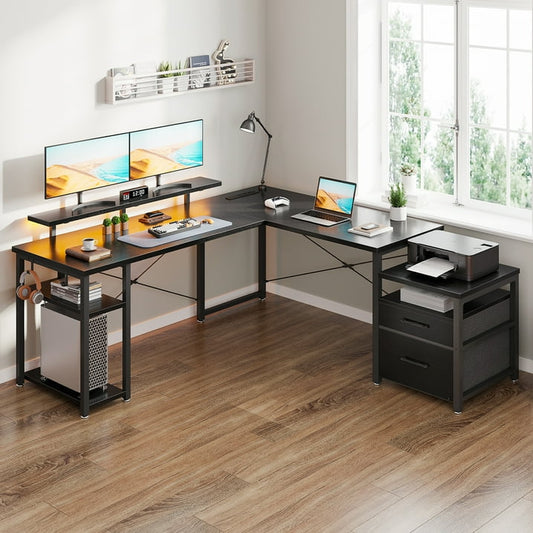 66" Reversible L Shaped Desk with File Drawer & Power Outlet, Modern Computer Desk with LED Strip, Home Office Desk with Storage Shelves, Gaming Desk with Monitor Shelf, Corner Desk, Black