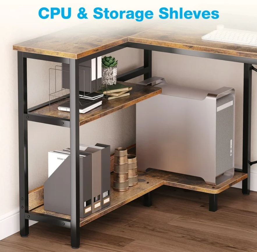 - The corner computer desk design includes storage shelves and a CPU stand, allowing you to keep your workspace organized and clutter-free.