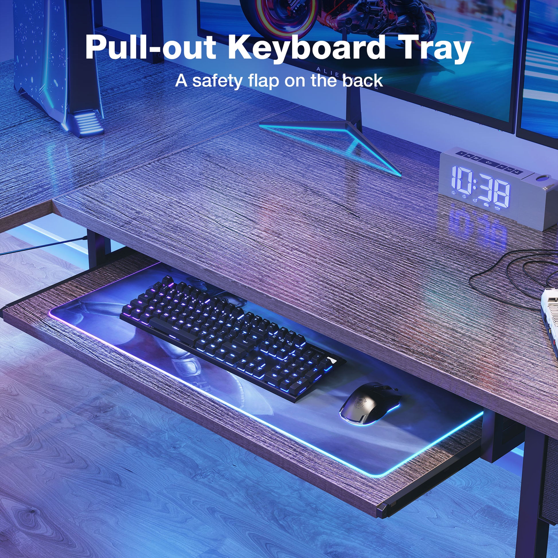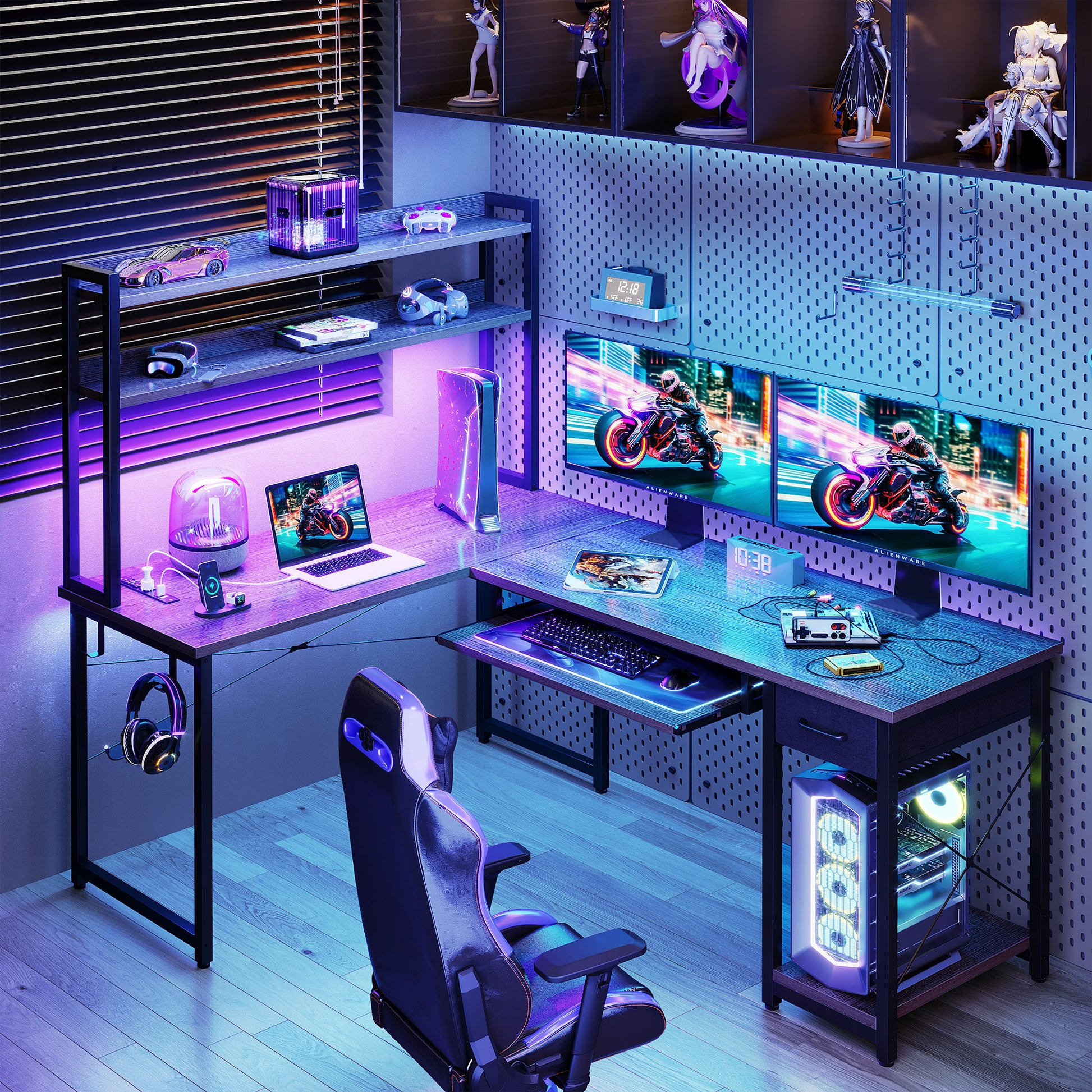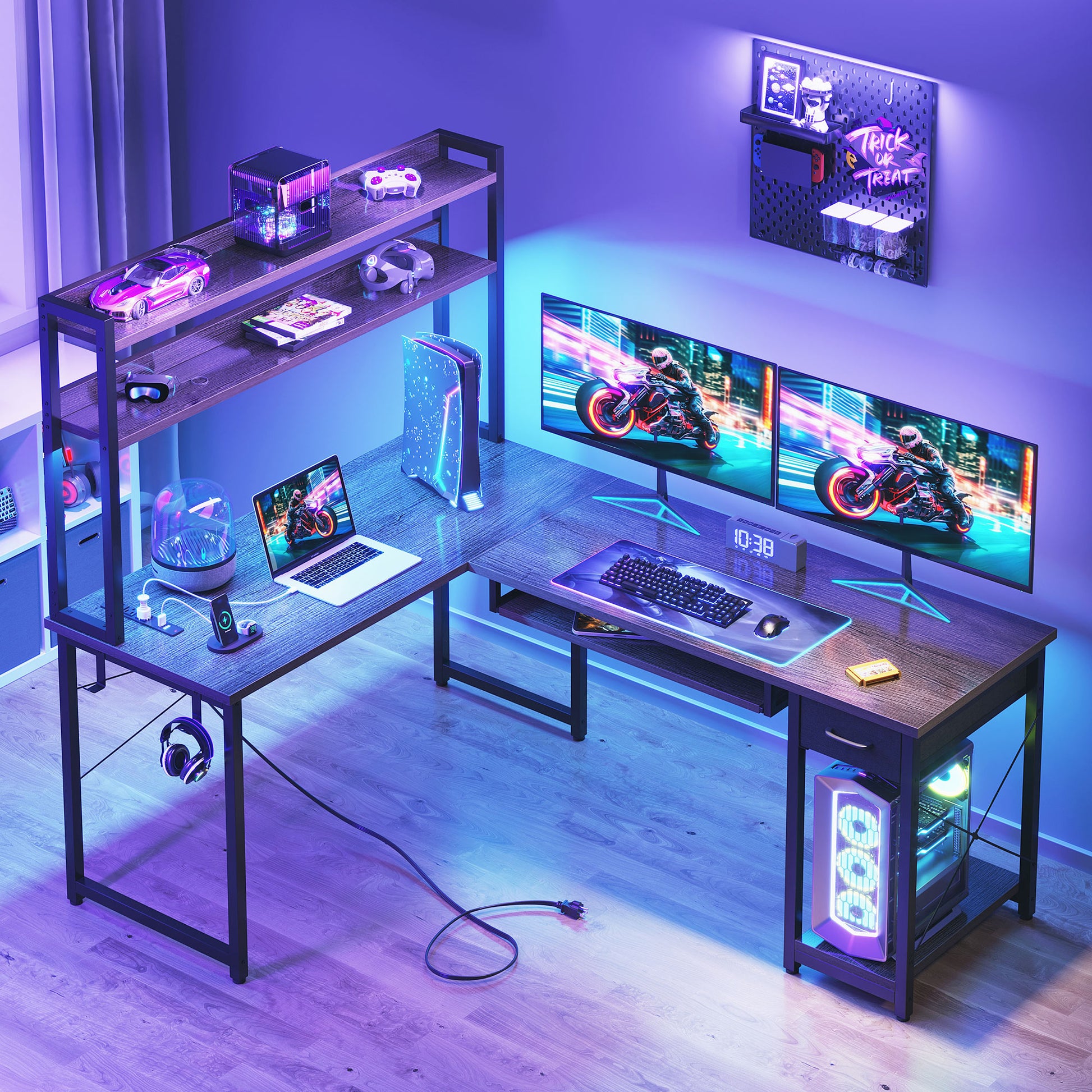 59" Reversible L-Shaped Gaming Desk with Power Outlets & LED Lights, Office Desk with Storage Drawer & Keyboard Tray for Home Office, Corner Computer Desk with Hutch, Grey Oak