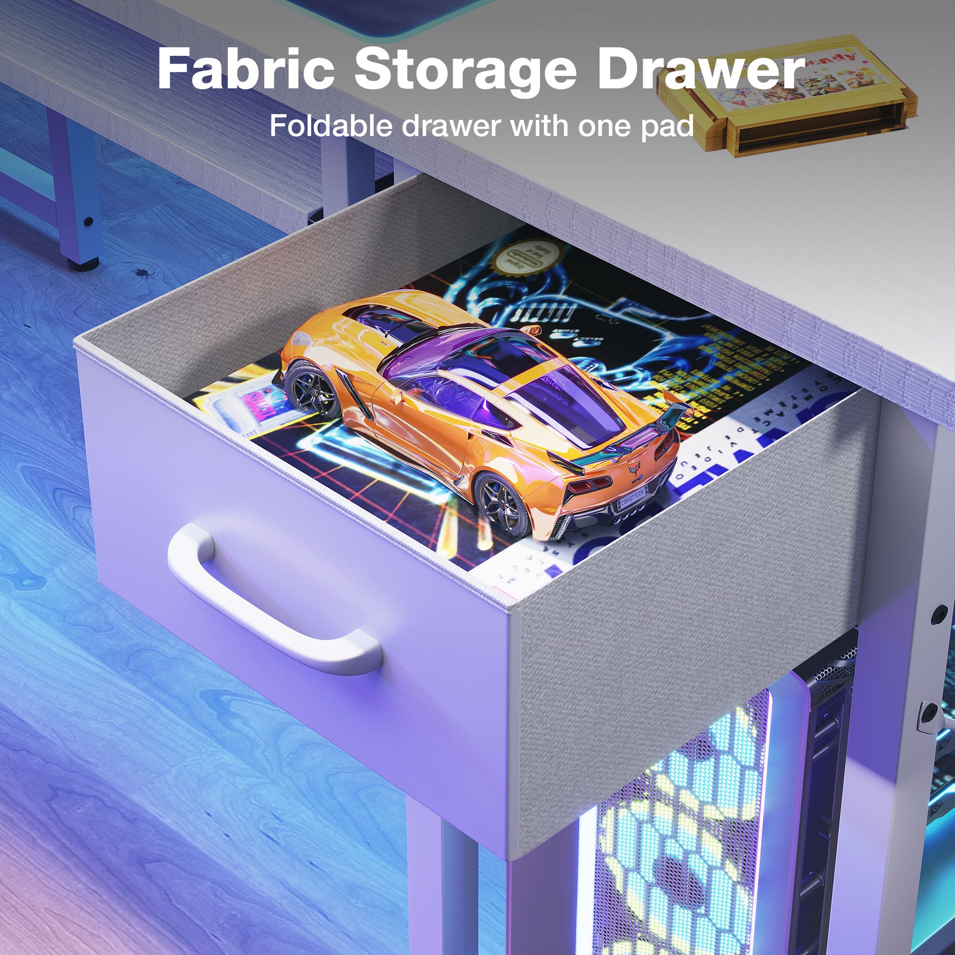 59" Reversible L-Shaped Gaming Desk with Power Outlets & LED Lights, Office Desk with Storage Drawer & Keyboard Tray for Home Office, Corner Computer Desk with Hutch, White